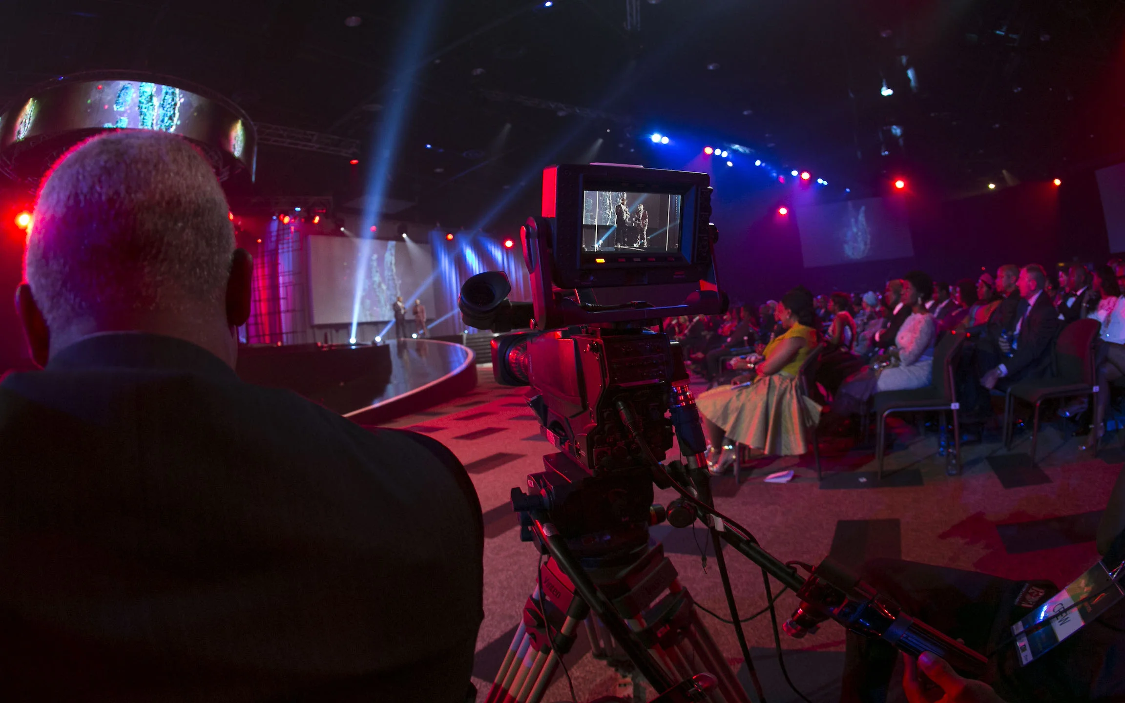 SPORT HAS NO BOUNDARY... This show was created as a 360º "stadium of sport" -Wrapping itself, stadium-like, around the audience. The opening AV introduced the audience to the "stadium-environment" with a wrap-around, 9-screen blend -Setting the scenes for the immersive, live show design to come. Our sporting heroes were brought to life like never before -Staged in layers. Moving from, & off the stage -out around, over, through & into the audience. SA team swimmers literally “swam through the air” -off the stage, & over the audience, SA team long jumpers & triple jumpers -jumped off the stage & “over the audience”… Dancers performed in a water-filled swimming pool -live on stage. …-While tap dancers defied gravity -dancing -suspended up-side-down on the ceiling of the venue!